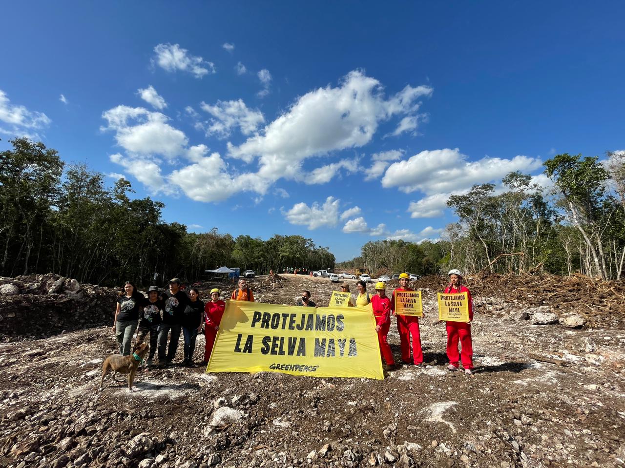 Una pancarta gigante de Greenpeace desplegada en la torre Estela de la Luz, en la Ciudad de México a finales de septiembre anunciaba : "¡La selva maya clama!" para denunciar los daños ecológicos causados por el Tren Maya y otras industrias en el sureste de México. La acción se produce tras años de protestas por el creciente impacto ecológico del tren, cuya expansión al transporte de mercancías se prevé que se extienda a Guatemala y Belice.
