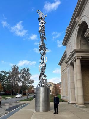 La escultura, compuesta por letras extraídas de múltiples alfabetos, refleja un motivo que el artista ha utilizado frecuentemente para explorar el lenguaje y la humanidad compartida.