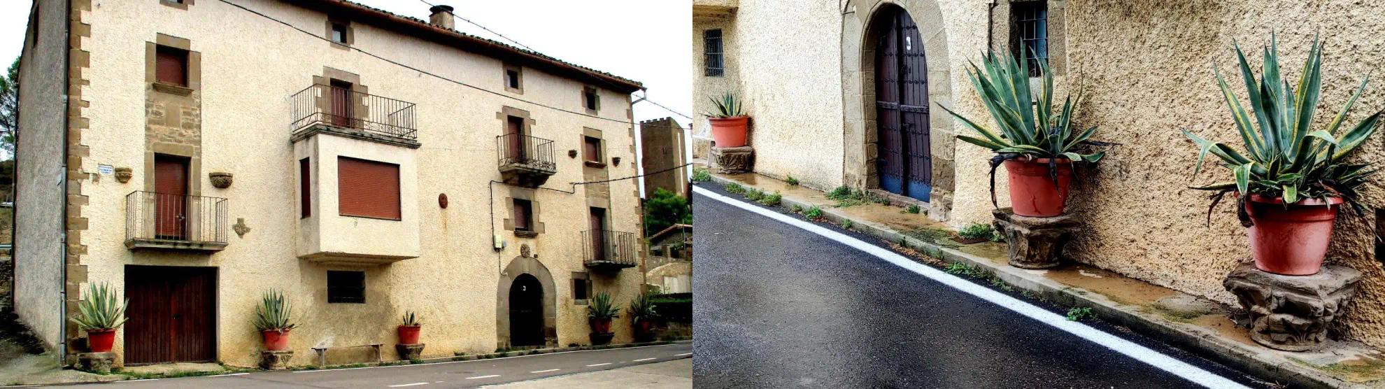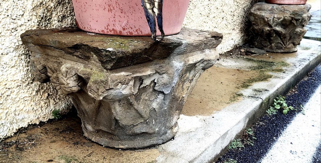 REDACCIÓN. En la plaza del Ayuntamiento de Navardún (Zaragoza), en la fachada de un domicilio particular, se emplean como simples maceteros cinco capiteles procedentes del Castillo de Navardún (BIC).