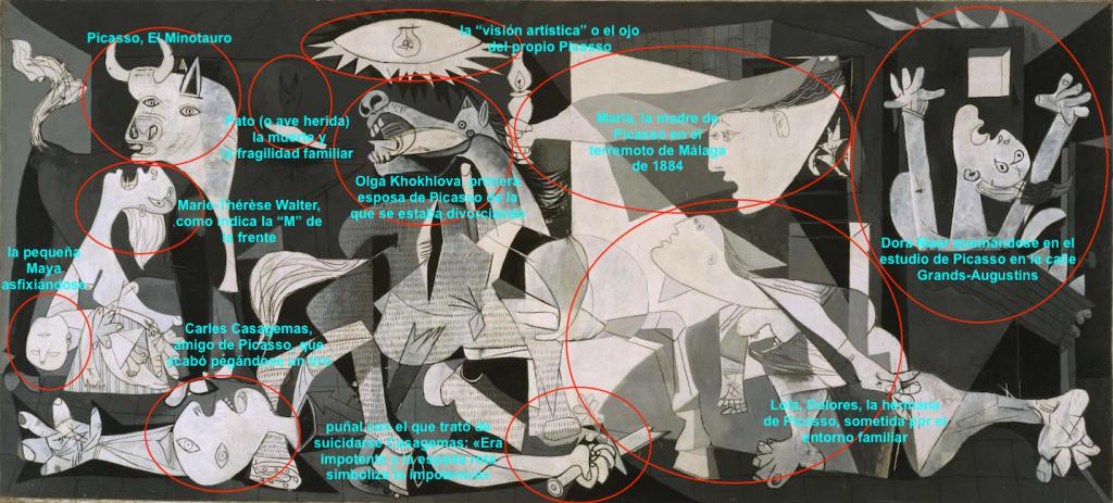 Según el catedrático, la obra «sintetiza tres momentos clave en la vida de Picasso : el terremoto de Málaga, cuando tenía tres años; la muerte de Casagemas y su conflicto personal en los años 30, con el divorcio de su primera esposa y su harén de amantes.